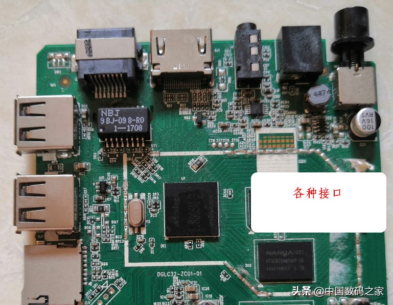 主板接口,2个USB口,一个TF插槽,别的的与网络机顶盒配备基本上同样,一个100兆网线端口,一个HDMI复合型视頻輸出插口,AV视頻輸出,开关电源键入及电源总开关。