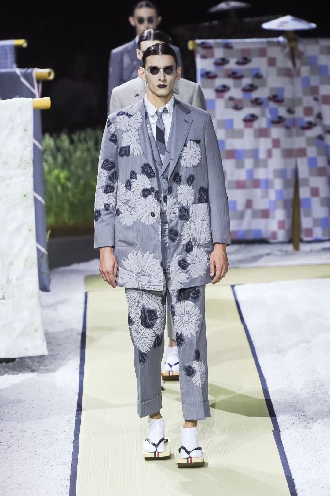 纽约时尚品牌 THOM BROWNE 对于日本元素的运用也在 2016 年春夏系列秀场上展示出来,该品牌将日式现代风格的印花和经典西装版型相互结合,呈现出一种内刚外柔的感觉,除此之外,秀场上的模特造型也是一大焦点,模特脚穿日式木屐,头梳日式中分头,配合着秀场音乐和脚踩榻榻米前行,呈现出一种别具一格的日式风格。